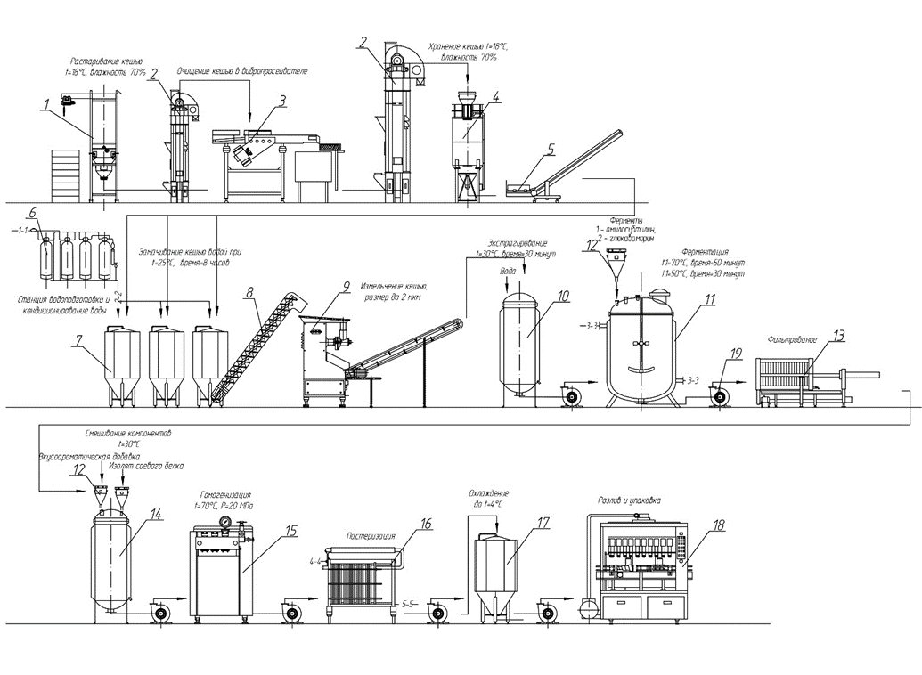 Современное производство растительных напитков представляет собой сложный многостадийный процесс, требующий не только глубокого понимания биохимии сырья, но и тщательной проработки требуемого оборудования. От правильного выбора и последовательности работы зависят органолептические показатели, микробиологическая безопасность, пищевая ценность и стабильность готового продукта при хранении. На основе технологической схемы было подобрано оборудование и составлена машинно-аппаратурная схема с учетом производительности линии.
