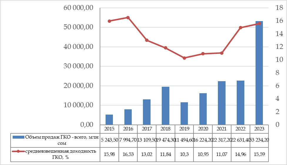 Рисунок 2 — Объемы продаж ГКО за 2015-2023 годы, млн сом