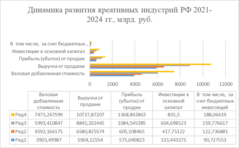 Рис.1. – Динамика развития и вклад в создание добавленной стоимости креативных индустрий в РФ в 2021–2024 годах