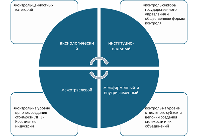 Каждый уровень контроля формирует собственные противоречия и ограничения, которые не могут быть устранены локальными управленческими решениями. Это обосновывает необходимость перехода к интегрированной модели контроля, ориентированной на согласование экономических, экологических и ценностных целей развития. В условиях развития креативных индустрий контроль следует трактовать не как инструмент механического управления отклонениями по показателям финансов, эффективности и объемов производства, а как механизм управления противоречиями между экспериментальной природой креативного продукта, стратегической значимостью материального ядра креативного продукта для экономики РФ, коммерческими ограничениями бизнеса и требованиями экономики цикла. Такая трактовка предполагает расширение предмета контроля за пределы финансовых и операционных показателей и включение в него экологических, аксиологических, культурно-семиотических и институциональных измерений.