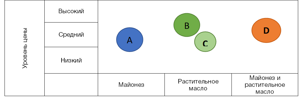 Ниже проведен анализ конкурентов и представлено рыночное позиционирование организации в целевых сегментах. На рисунке 1 представлена модель стратегических групп по масложировой продукции, в которой по горизонтали – продукты, по вертикали – уровень цены (высокий, средний, низкий). В группе А организации, производящие майонез по среднем ценам (АО «Эссен Продакшн АГ» с брендами: «Махеевъ» и «Добрая хозяйка»).
